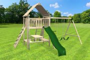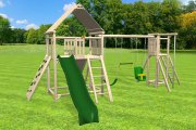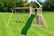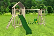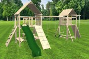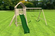 Rustic wood playset with slide, ramp, swings, and more